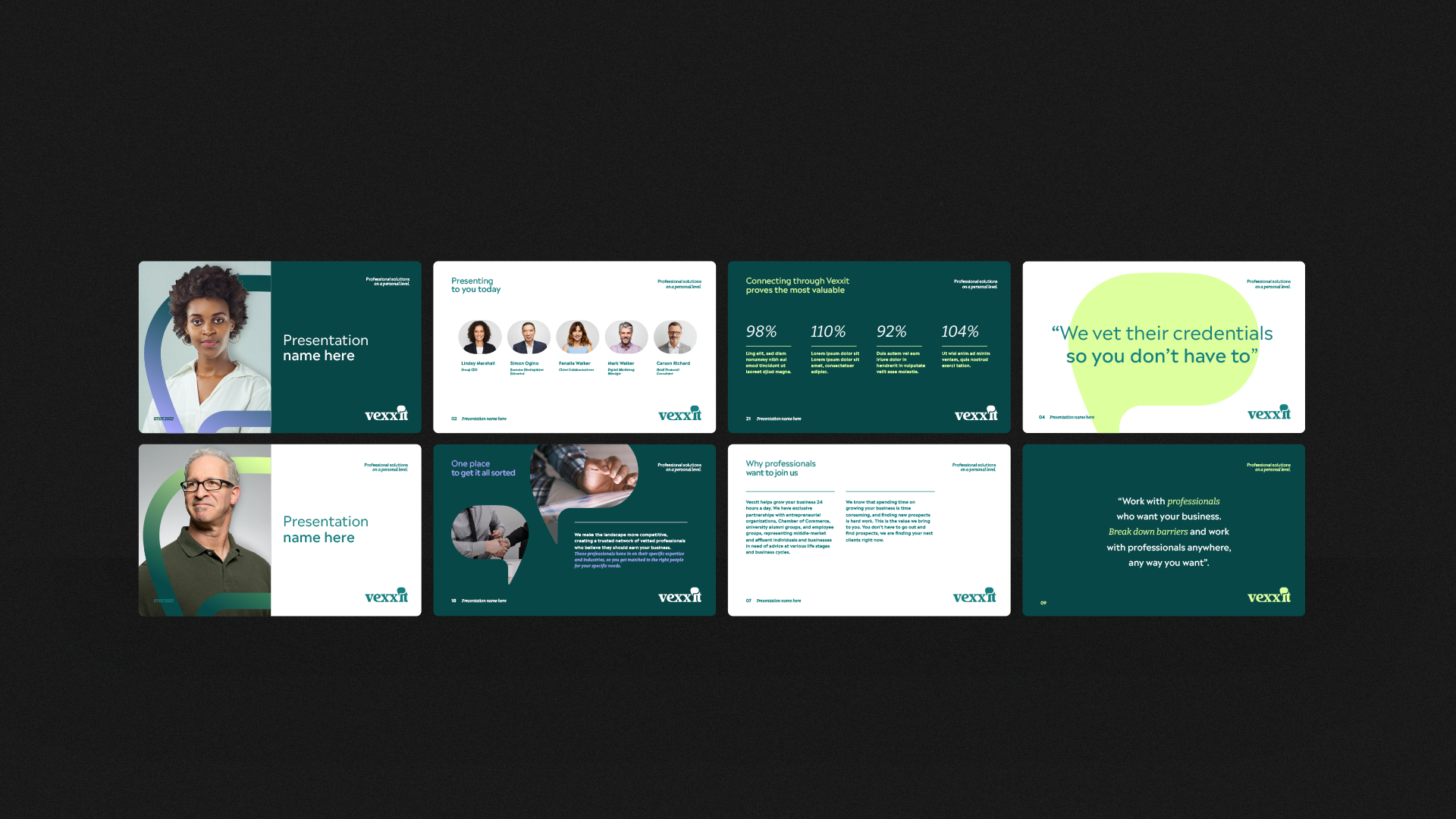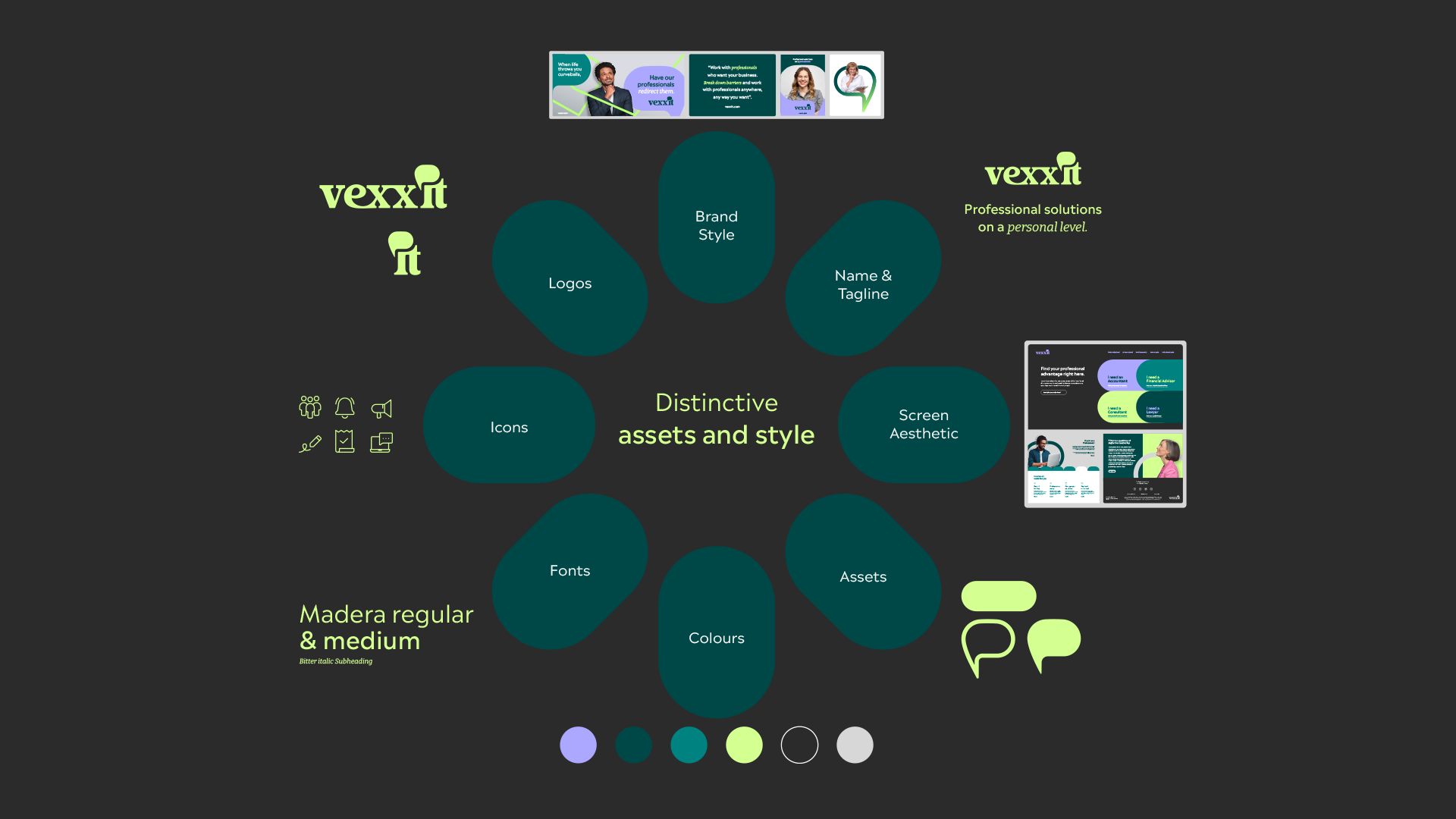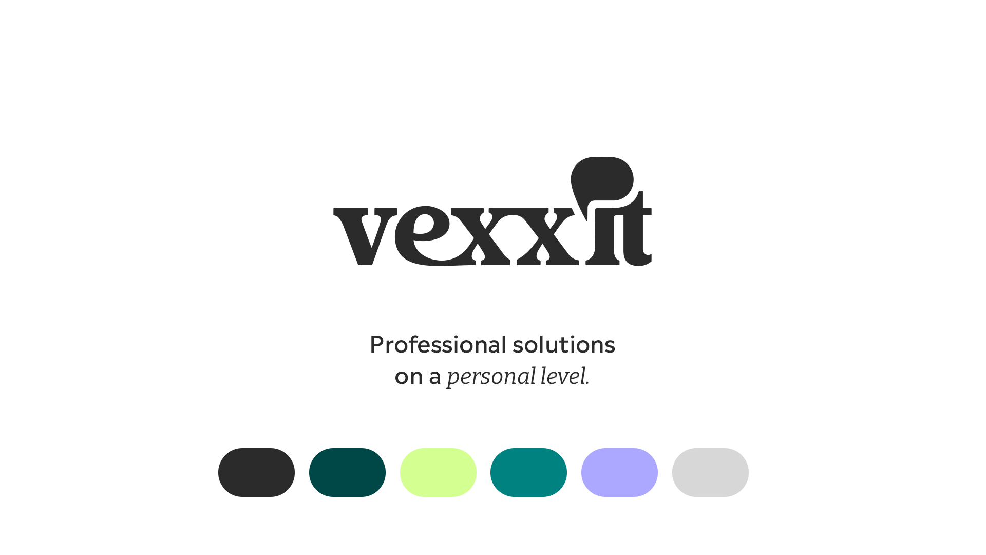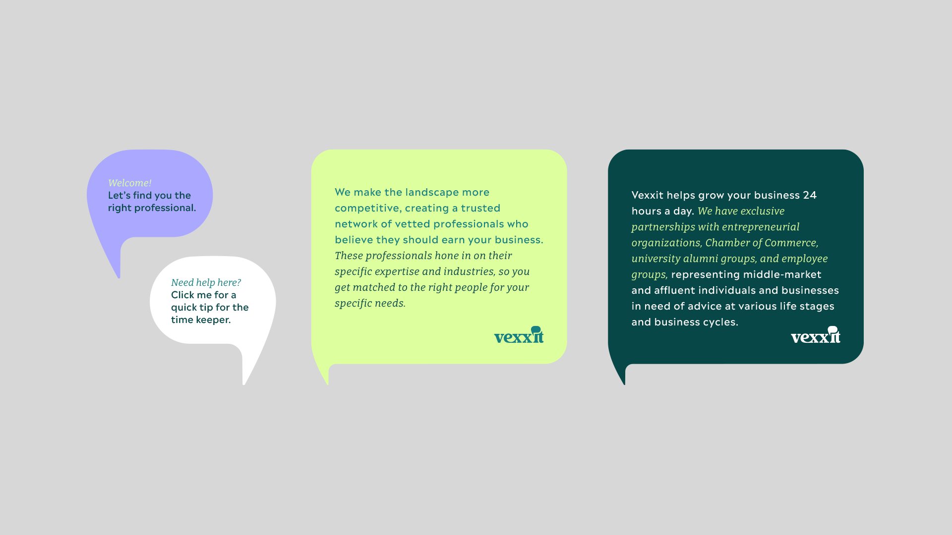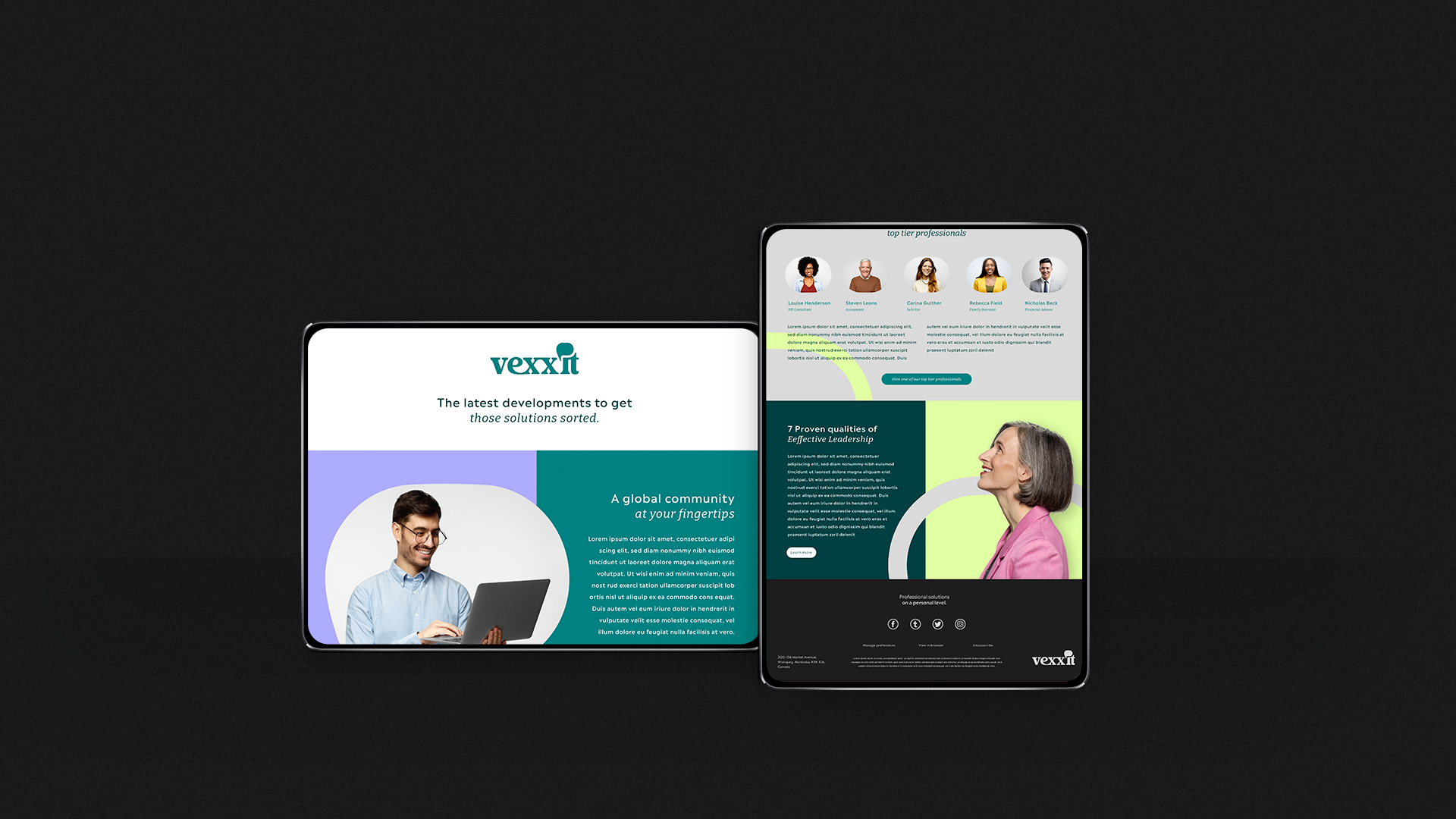 A sophisticated palette in the way that it works on multiple levels. Depending on which colours are paired together, we get a range of emotions across—from energized, powerful, and confident, to soothing, reassuring and friendly. It’s a refreshing take on the professional community and unique to Vexxit.