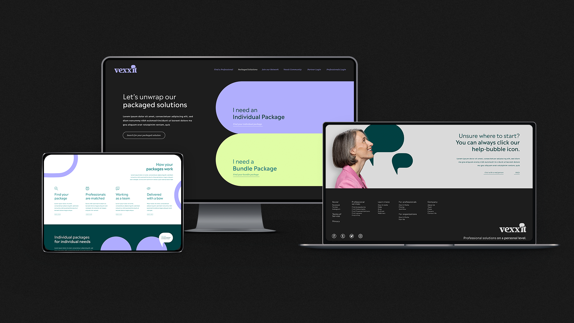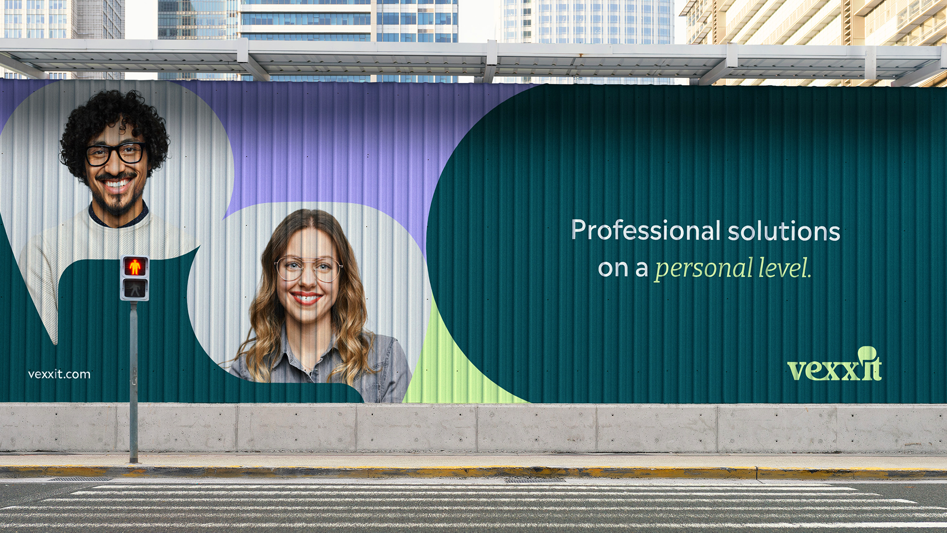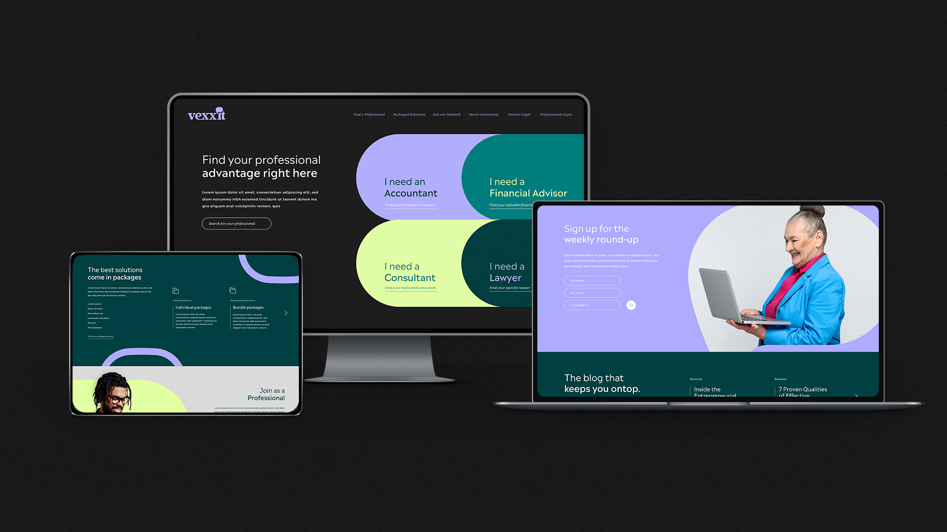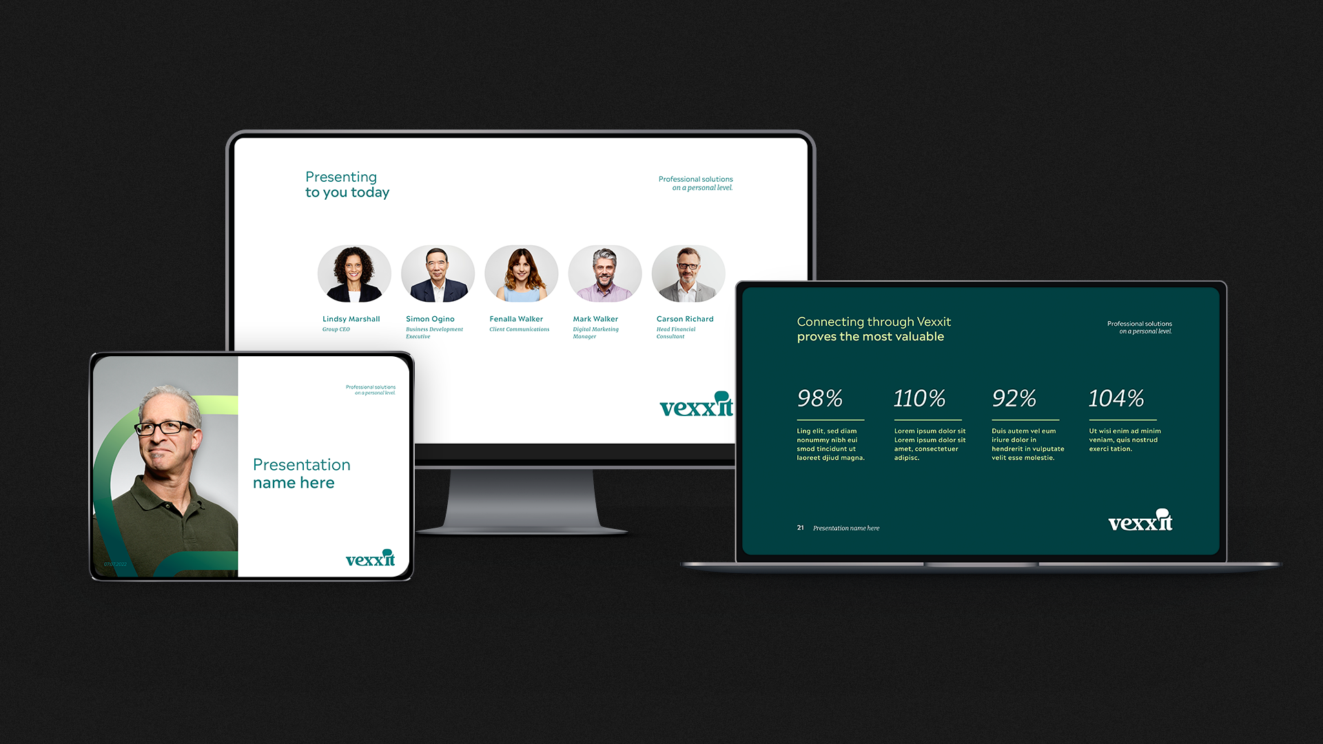 A sophisticated palette in the way that it works on multiple levels. Depending on which colours are paired together, we get a range of emotions across—from energized, powerful, and confident, to soothing, reassuring and friendly. It’s a refreshing take on the professional community and unique to Vexxit.
